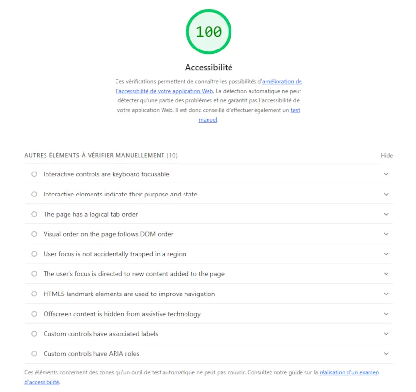 Penser qu’un score de 100 vous garantit une accessibilité totale est une idée reçue : le rapport sur l’accessibilité de Lighthouse est la partie émergée de l’iceberg, et il n’aborde que les critères les plus importants.