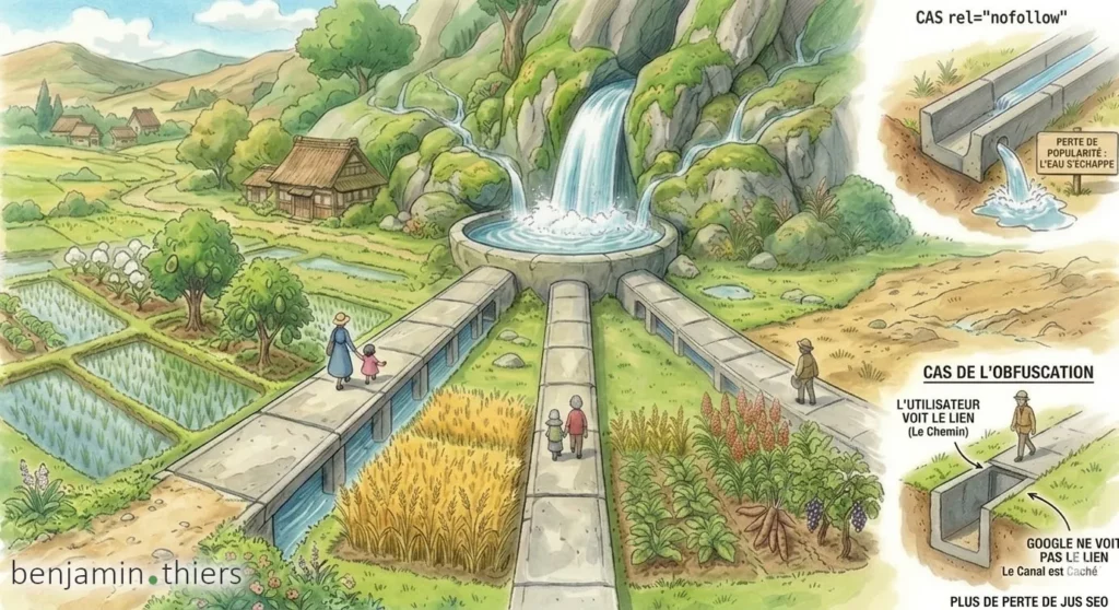 L’attribut rel="nofollow" revient à laisser la vanne ouverte au niveau de la source, puis à faire à un trou dans le canal pour que l’eau s’en échappe. Le promeneur longe le canal jusqu’à la plantation, sans réaliser que l’eau finit dans la nature et qu’elle n’arrive jamais jusqu’au champ.
